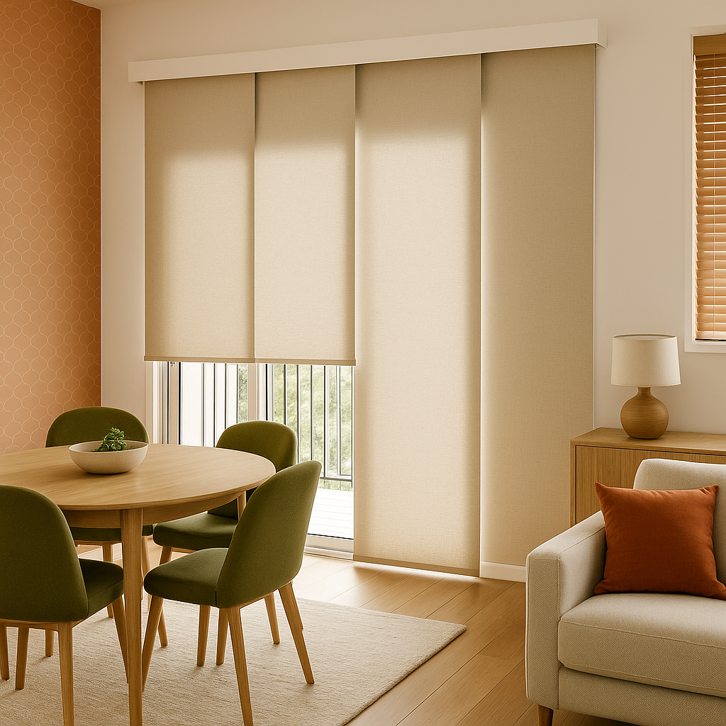 Panel glide blinds are made up of wide fabric panels that slide effortlessly along a track. When opened, the panels stack neatly to the side, letting in plenty of natural light and giving you full access to your view or doorway. When closed, the panels create a soft, sleek wall of fabric that provides excellent privacy and light control.